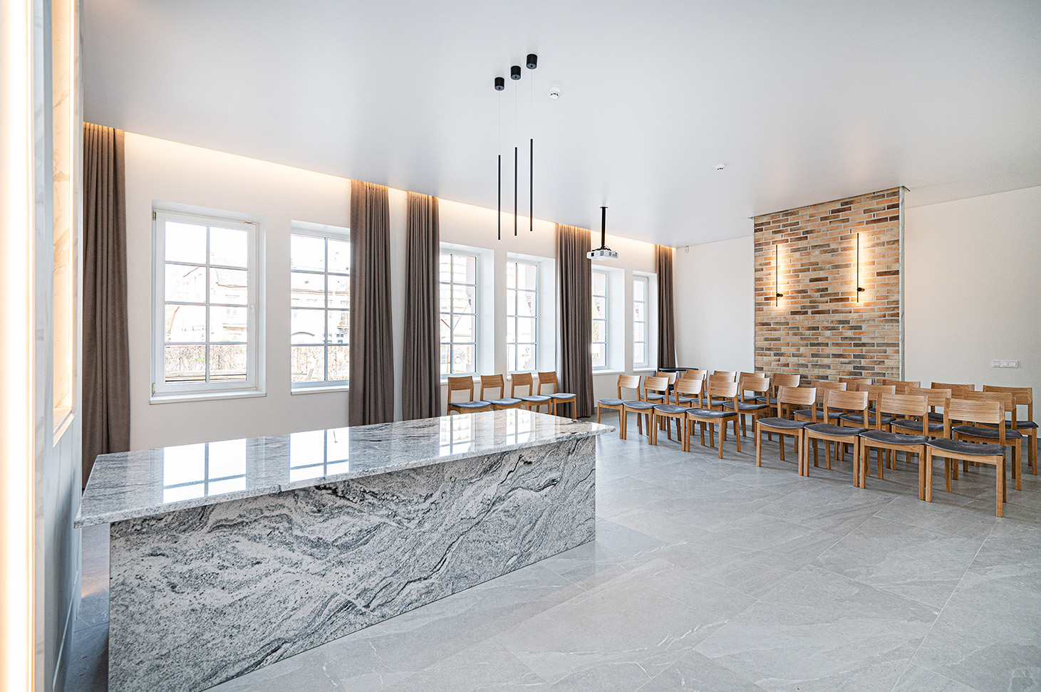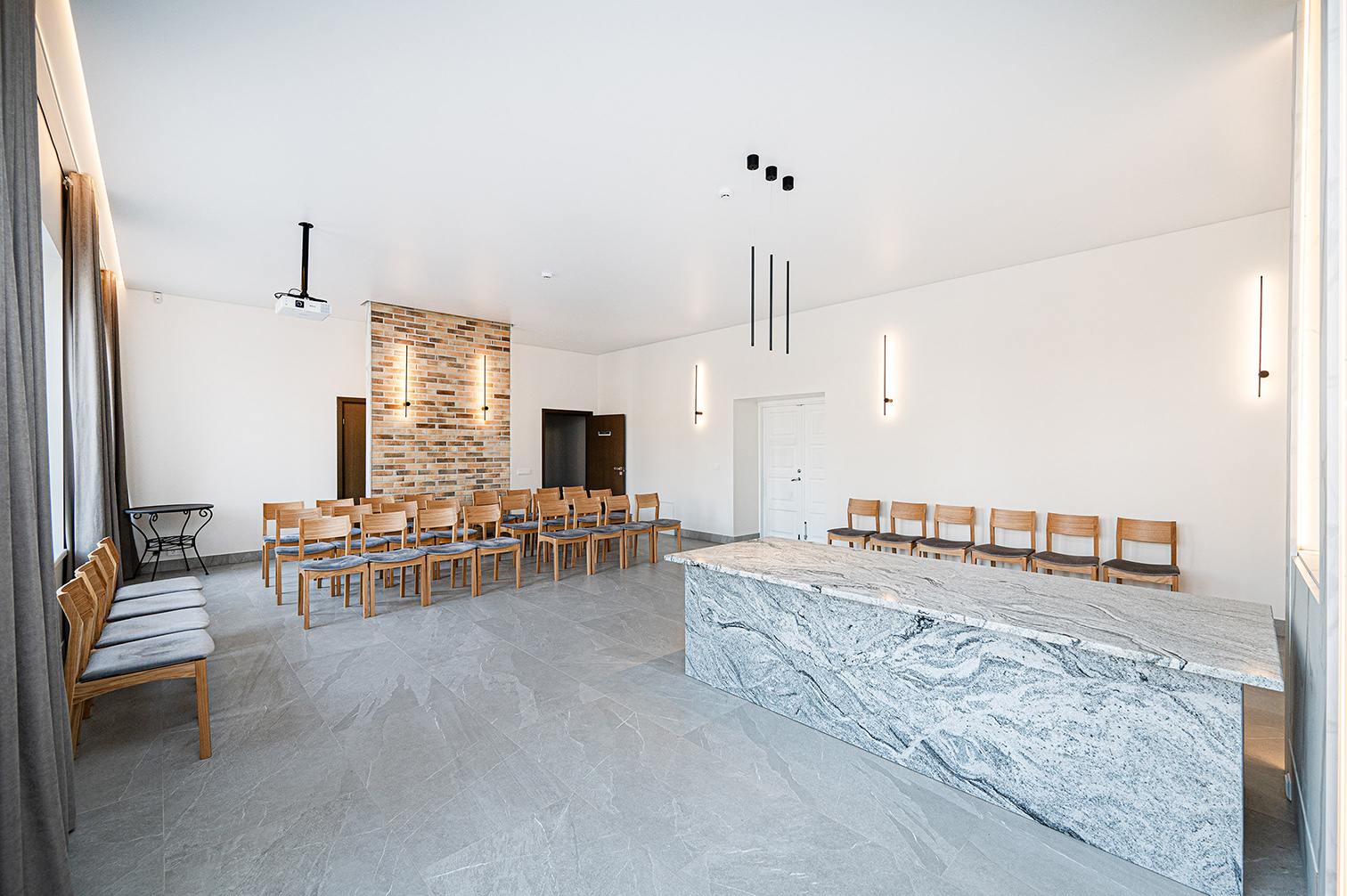 „Lakrimos“ nuomojamose šarvojimo salėse dominuoja švelnios, dėmesio neblaškančios spalvos, sukuriančios ramią, dvasingą atmosferą. Asketiška, bet jauki erdvė suteikia galimybę ramiai, pagarbiai ir su dideliu susikaupimu atsisveikinti su mirusiuoju.